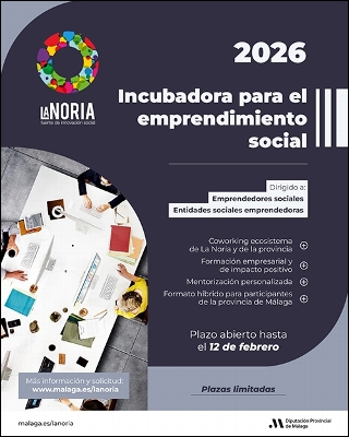 El centro de innovación social de la Diputación de Málaga abre la nueva convocatoria de la Incubadora para el Emprendimiento Social 2026. La Noria seleccionará hasta 20 ideas de negocio o iniciativas emprendedoras, promovidas tanto por personas emprendedoras como por entidades sociales, que participarán en un programa especializado de incubación orientado a transformar propuestas con impacto social en proyectos viables, sostenibles económicamente y con capacidad de generar un impacto positivo en la provincia de Málaga. El plazo de presentación de candidaturas permanecerá abierto hasta el jueves 12 de febrero en lanoriamalaga. es.